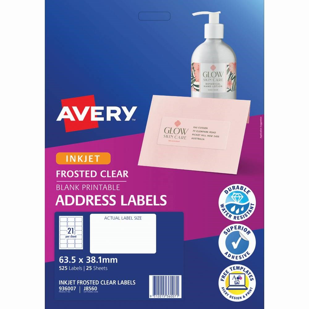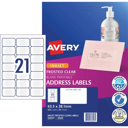 AVERY CLEAR INKJET LABELS J8560 21 PER SHEET PKT 25