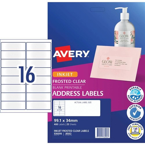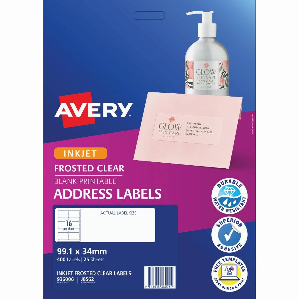 Avery Inkjet Frosted Clear Label 16UP 99.1x34mm 400 Labels, 25 Sheets