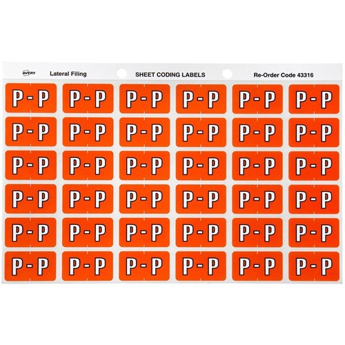 AVERY LATERAL FILING LABEL "P" SIDE TAB SHEETS PKT 180 DARK ORANGE