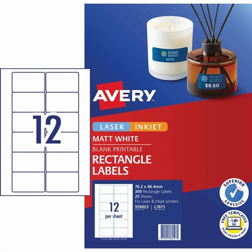 Size: 76.2x46.4mm 300 labels, 25 sheets. 12 labels per sheet (12UP).