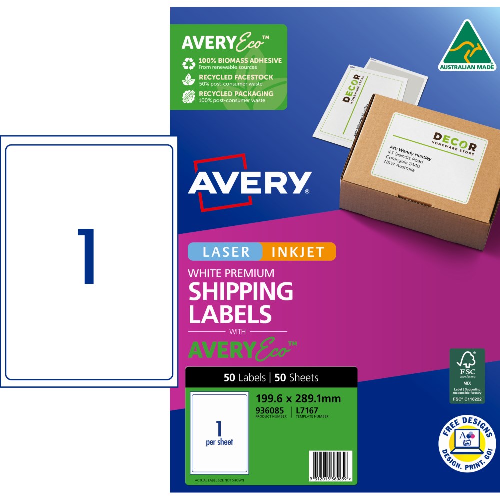 Avery Premium Shipping Labels White Laser Inkjet AveryEco L7167 199.6x289.1mm 1UP 50 Lab