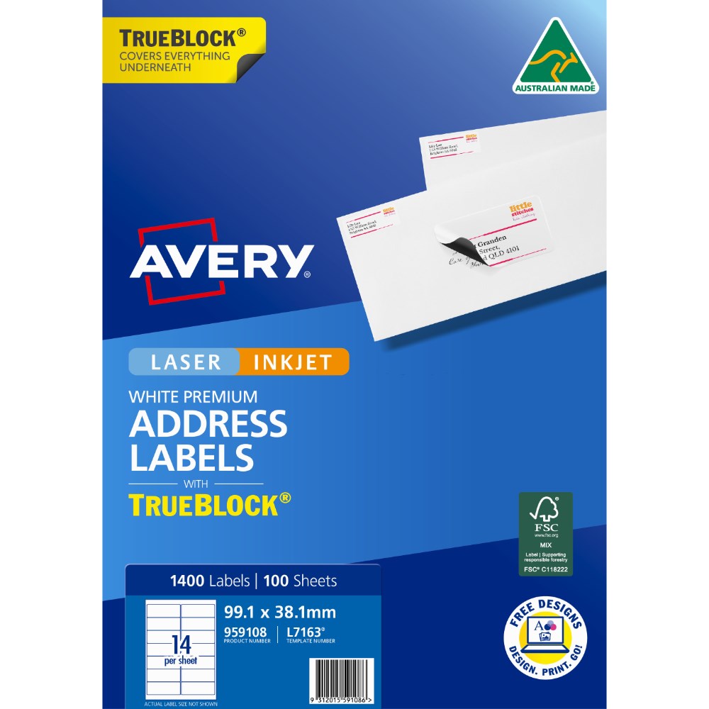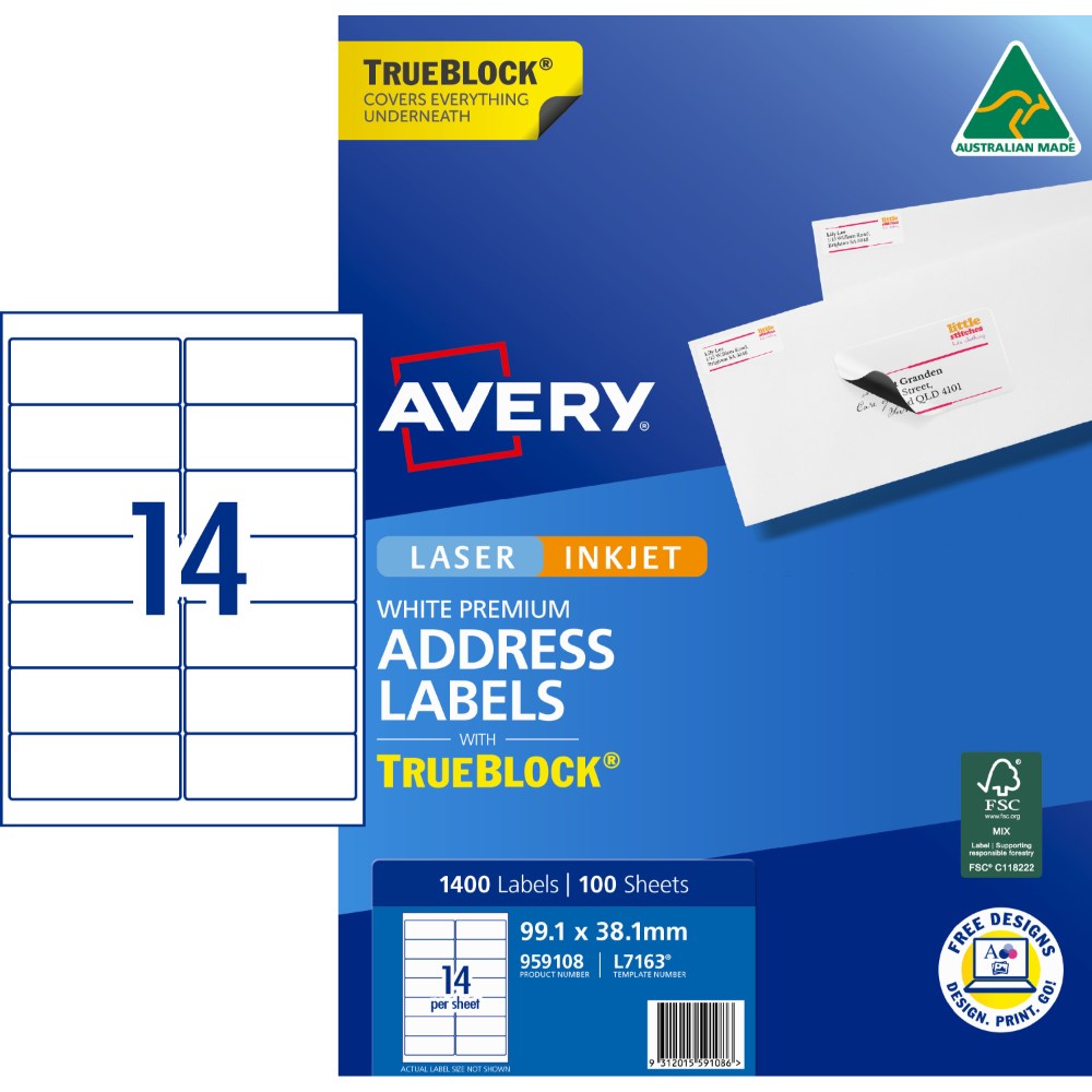 Avery Trueblock Address Labels Laser L7163 99.1 x 38.1mm 14UP 1400 Labels