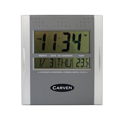 Features a digital display of time (12 or 24 hours), month, date, day, current temperature (switchable to celsius or fahrenheit) and alarm.