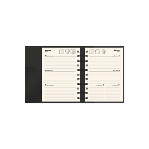 Pen loop, lay flat opening, ribbon marker and week to view layout.