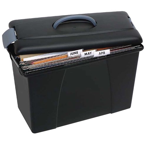 Stylish case, ideal for storing and transporting files safely and securely, with rails to support foolscap suspension files.