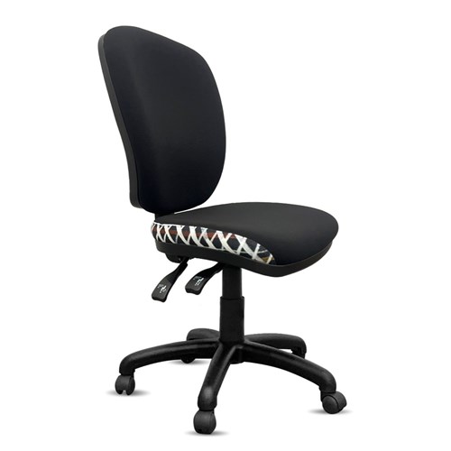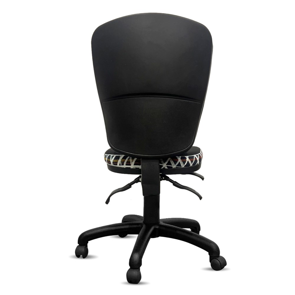 A unique commercial fabrics designed by Paulina Puruntatameri (Indigenous Artist) combined with K2 Black Fabric to upholster the chair.
