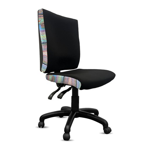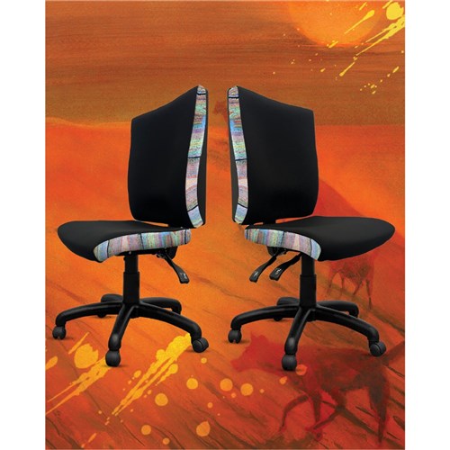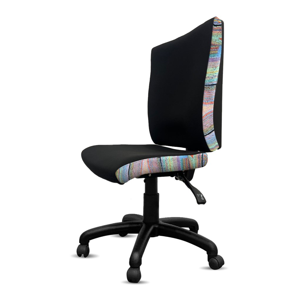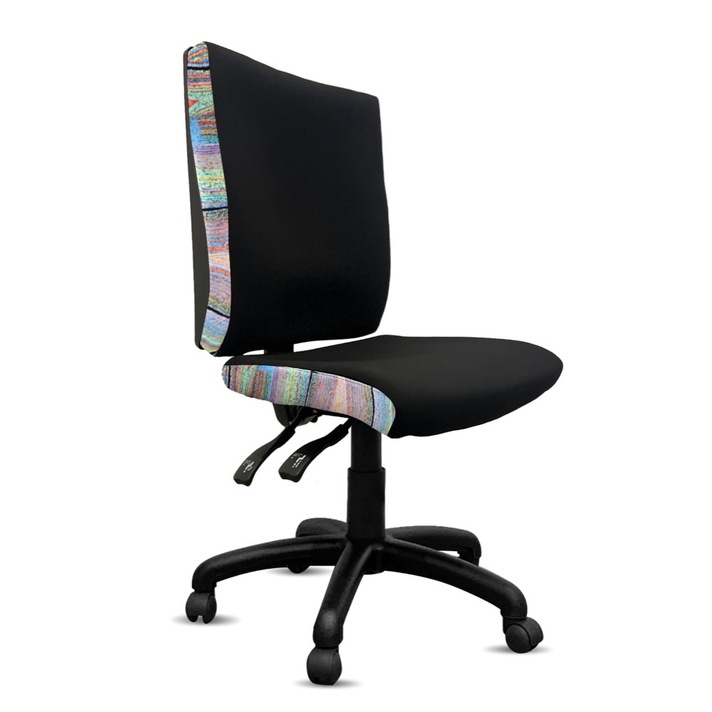 A unique commercial fabrics designed by Liddy Napanangka Walker (Indigenous Artist) combined with K2 Black Fabric to upholster the chair.
