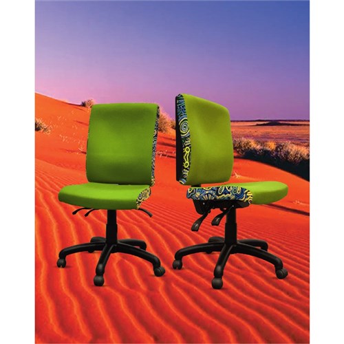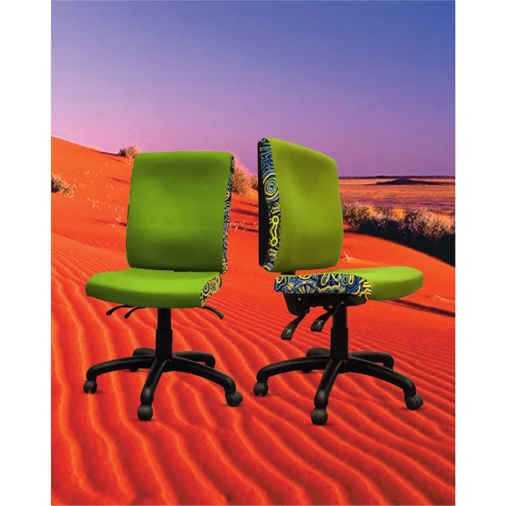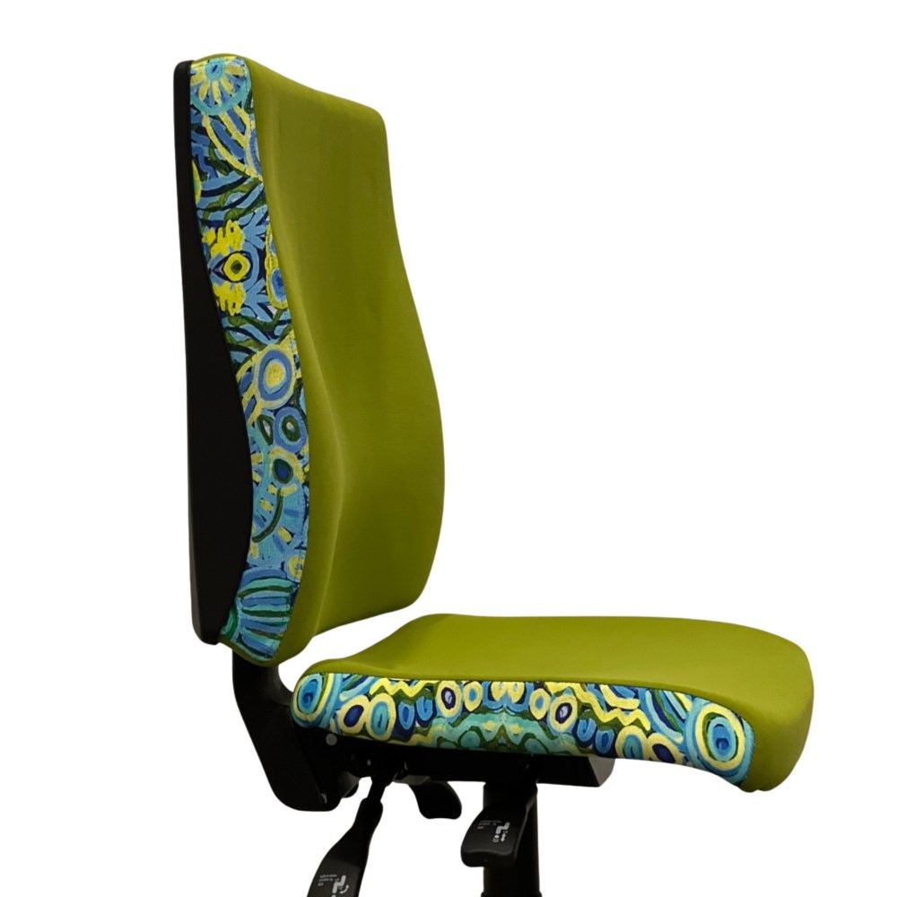 A unique commercial fabrics designed by Cedric Varcoe (Indigenous artist) combined with K2 Eucalyptus Green Fabric to upholster the chair.