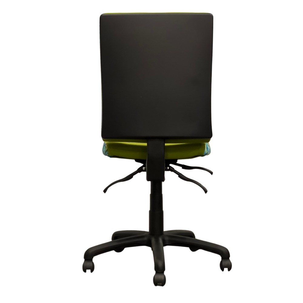 Heavy duty commercial chair with 3 lever mechanism and ratchet back height adjustment.