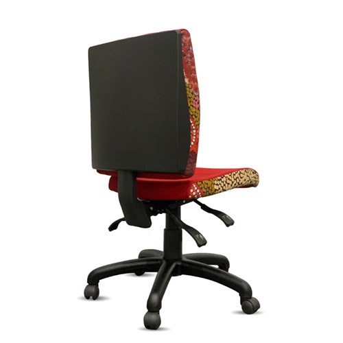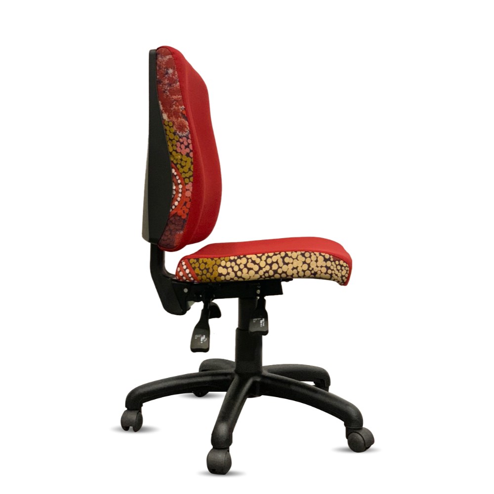 A unique commercial fabrics designed by Damien and Yilpi Marks (Indigenous artists) combined with K2 Red Ochre Fabric to upholster the chair.