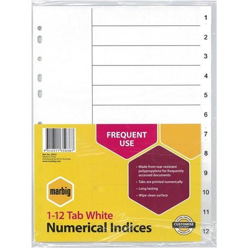 MARBIG POLYPROPYLENE INDICES NUMERICAL 1 - 12 A4 White