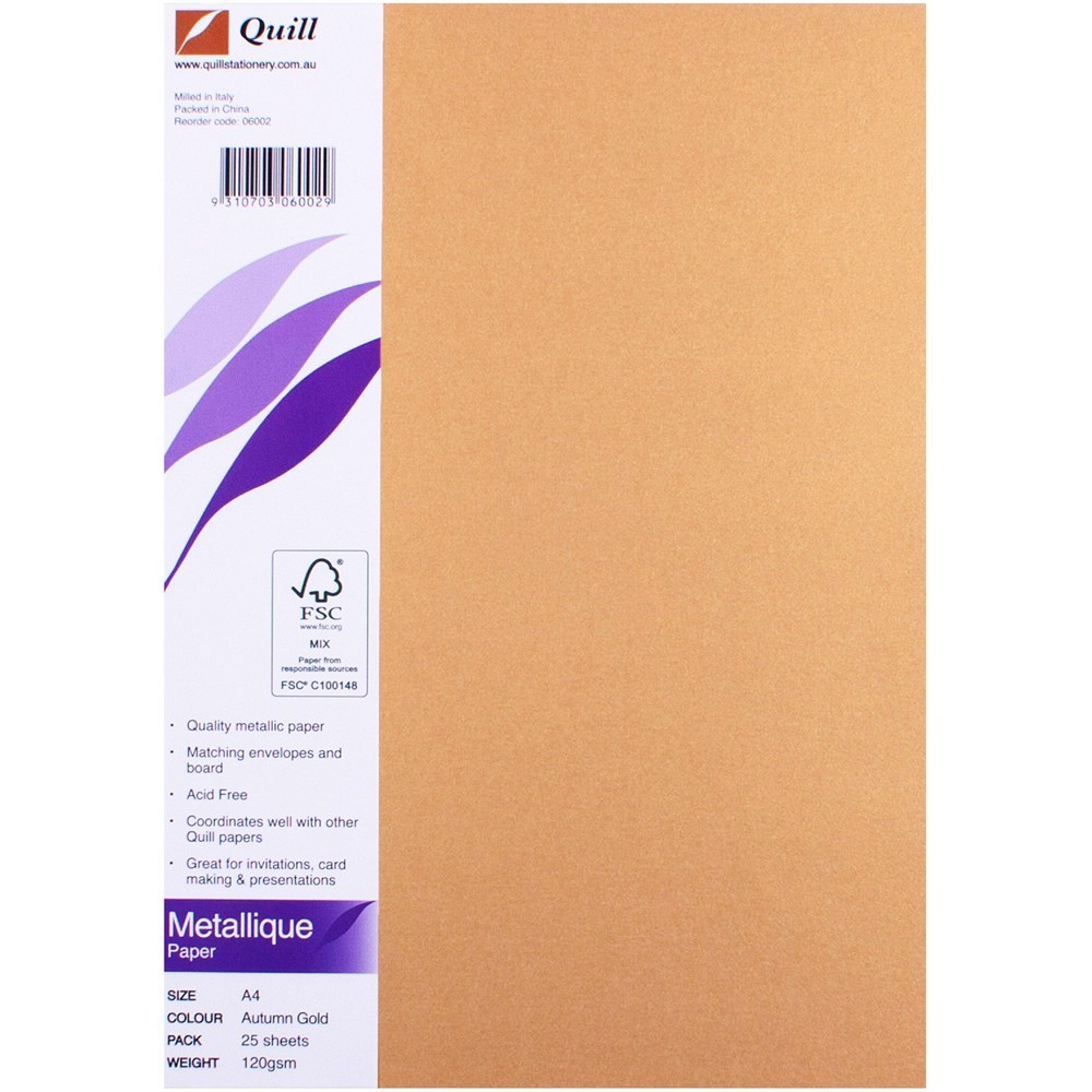 QUILL A4 METALLIQUE PAPER 120gsm Autumn Gold pk 25