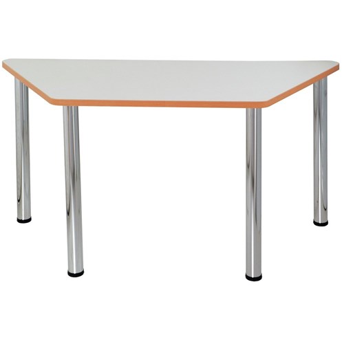 25mm tops are parchment (off-white) with a commercial grade rigid ply edging to take the knocks. Modern chrome legs.