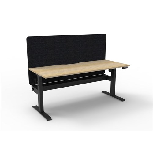 Electric height adjustable single sided workstation with Natural Oak top and Black Satin frame, Black Eco screen and cable tray.