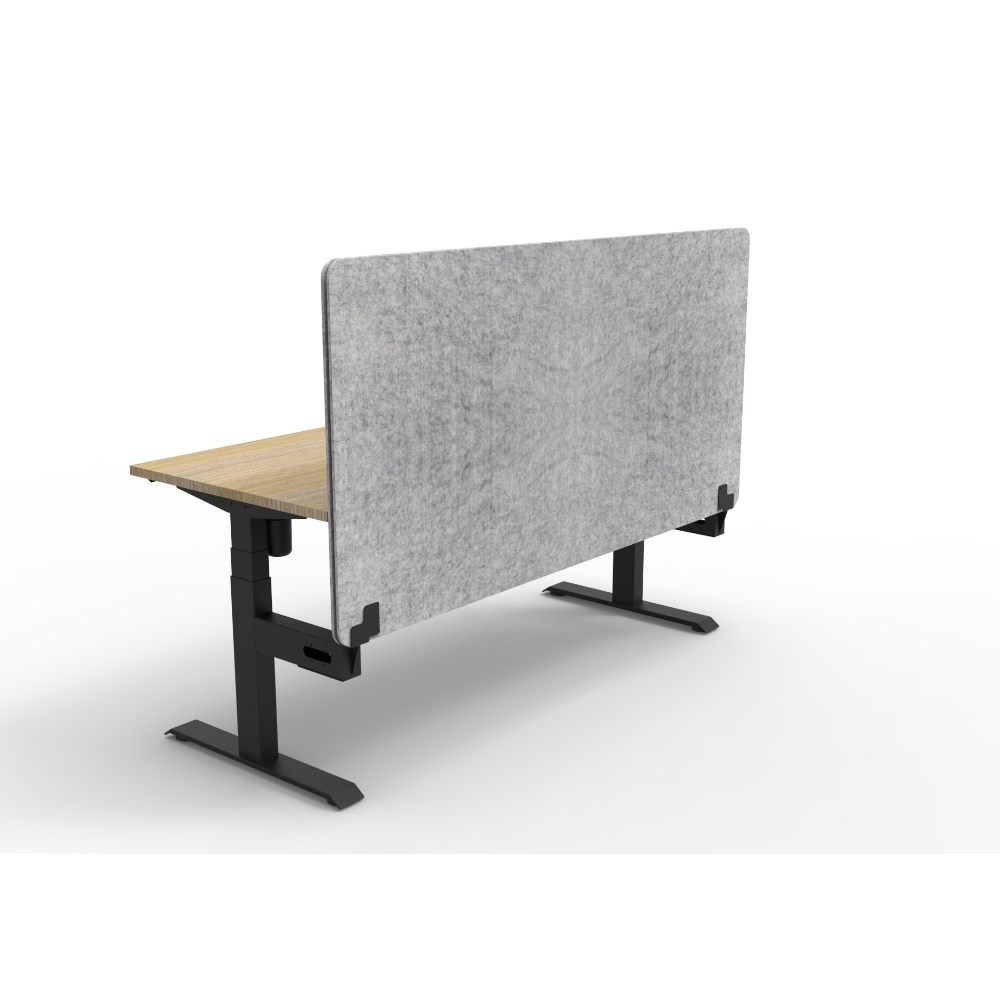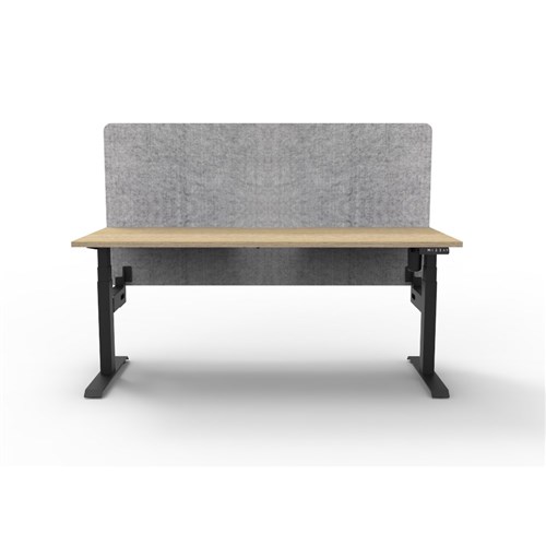 Electric height adjustable single sided workstation with Natural Oak top and Black Satin frame, Grey Eco screen.