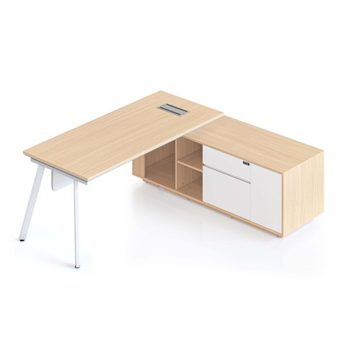 Natural Oak top and White Satin frame. Executive desk with Eternity legs, modesty panel and right hand side cabinet.