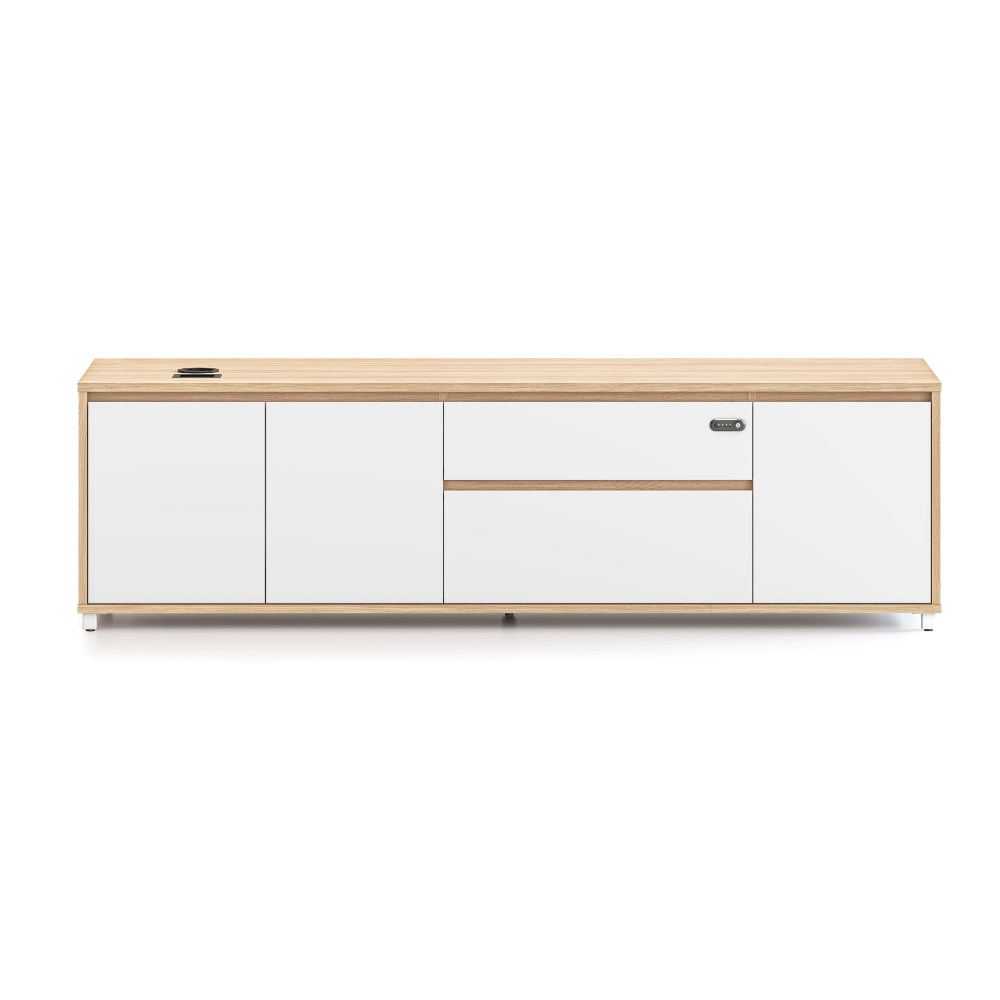 Executive desk right hand side cabinet for Executive Boost+ and Halo+ Workstations. Natural Oak carcass and Natural White drawer and door fronts.