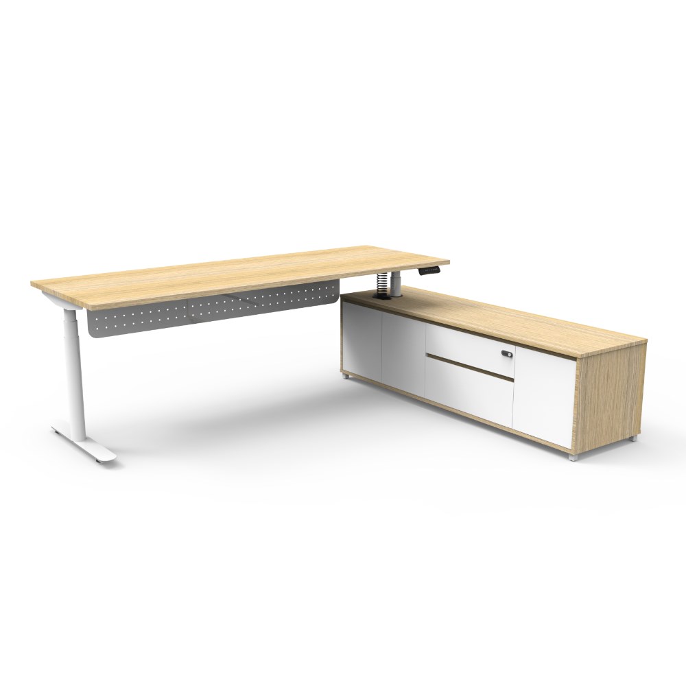 Rapidline Halo+ Executive Desk + RHS Cabinet + Panel 2270W x 1936D x 620-1270mmH Oak/White
