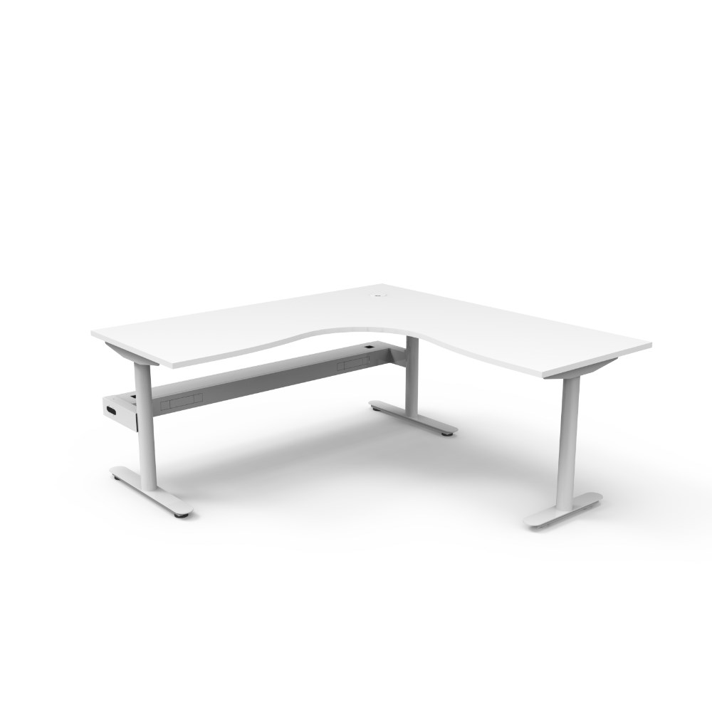 Natural White top White Satin frame. Corner workstation with cable tray.