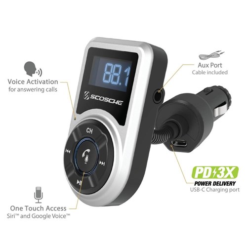 Scosche BTFreq Handsfree Car Kit Bluetooth FM Transmitter And 18W USB-C Charger Silver