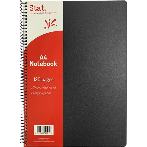 STAT NOTEBOOK A4 7MM RULED 60GSM SPIRAL SIDE BOUND 120 120 PAGE POLY COVER BLACK