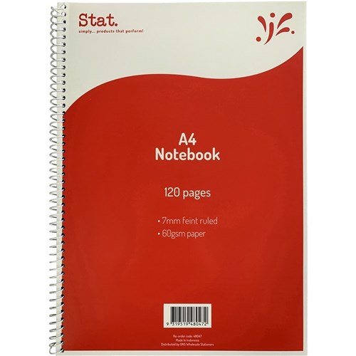 STAT NOTEBOOK A4 7MM RULED 60GSM SPIRAL SIDE BOUND 120 PAGE RED