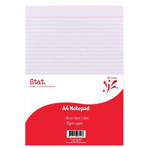 STAT NOTEPAD A4 8MM RULED 55GSM 50 SHEET WHITE