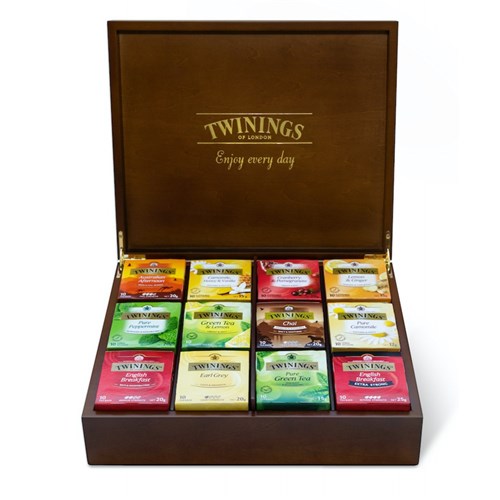 12 compartments contains a combination of teas in a uniquely crafted wooden box including: Green Tea and Lemon, Chai and Vanilla, Pure Camomile, English Breakfast, Earl Grey, Pure Green Tea, English Breakfast Extra Strong, Pure Peppermint,